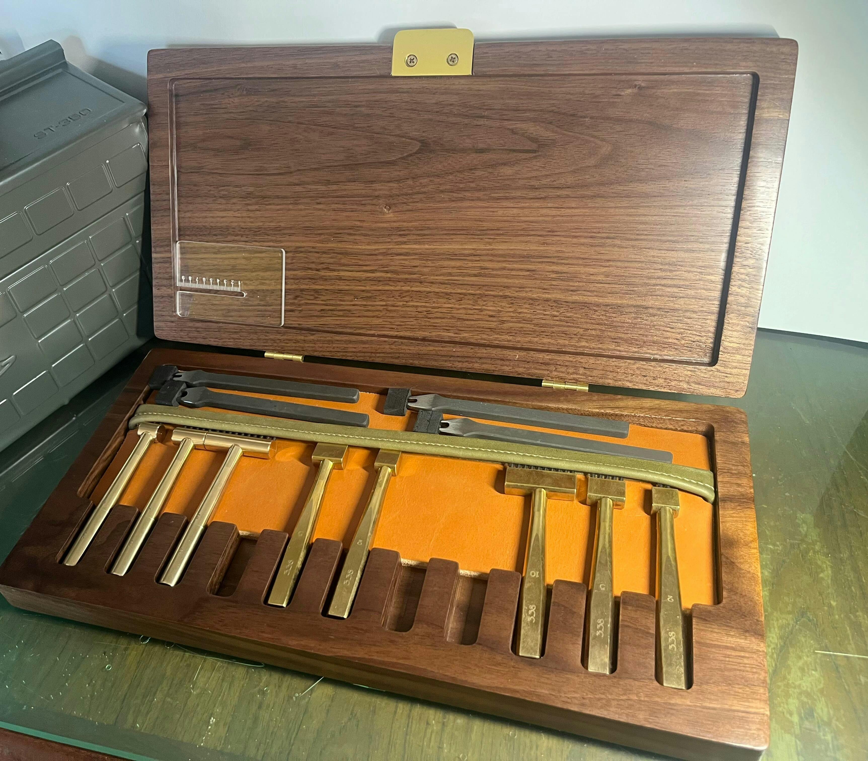 If you're looking for a simple, solid way to keep your pricking irons and punches organized, this 11-slot black walnut tray does the job well. It fits most common brands like Yorkshine, Amy roke, and others — even the slightly bulkier ones. With a clean lid to keep out dust, it’s a great addition to any leatherwork bench.